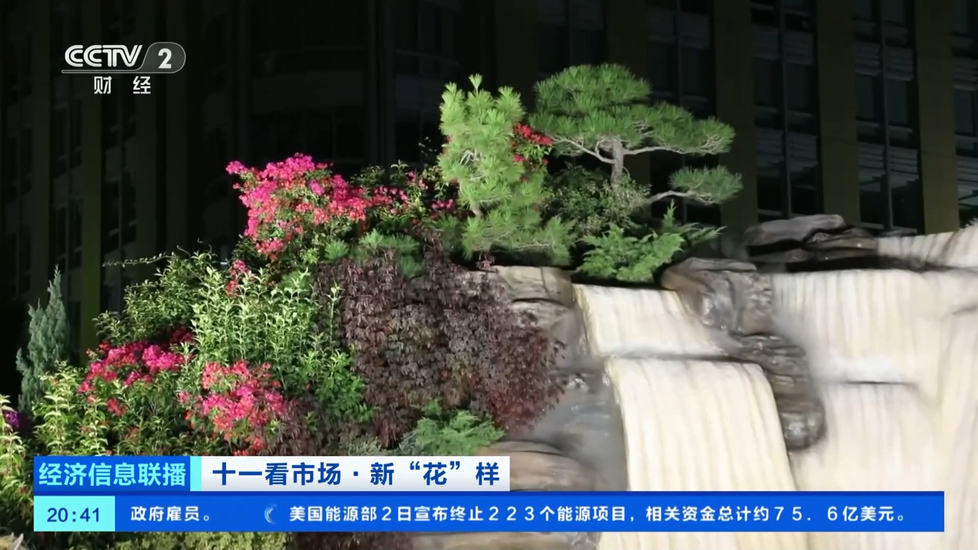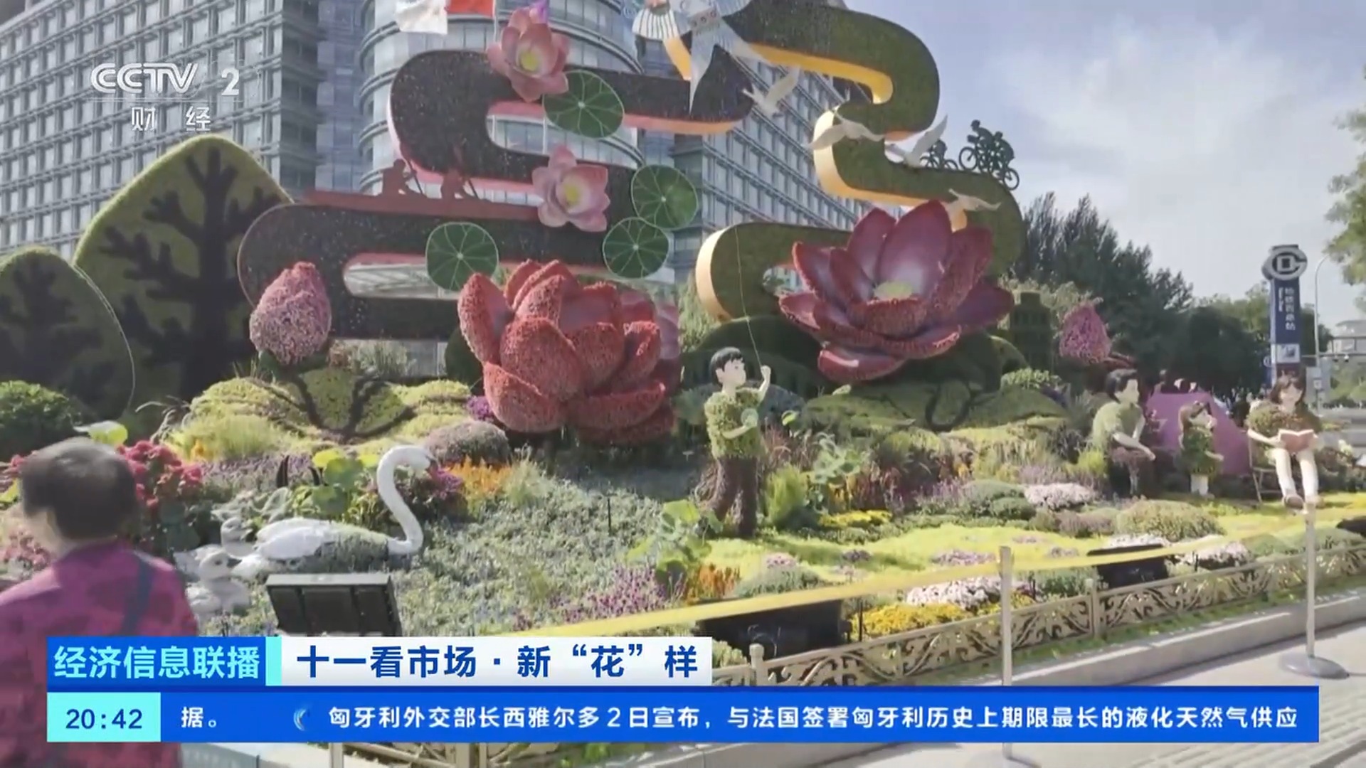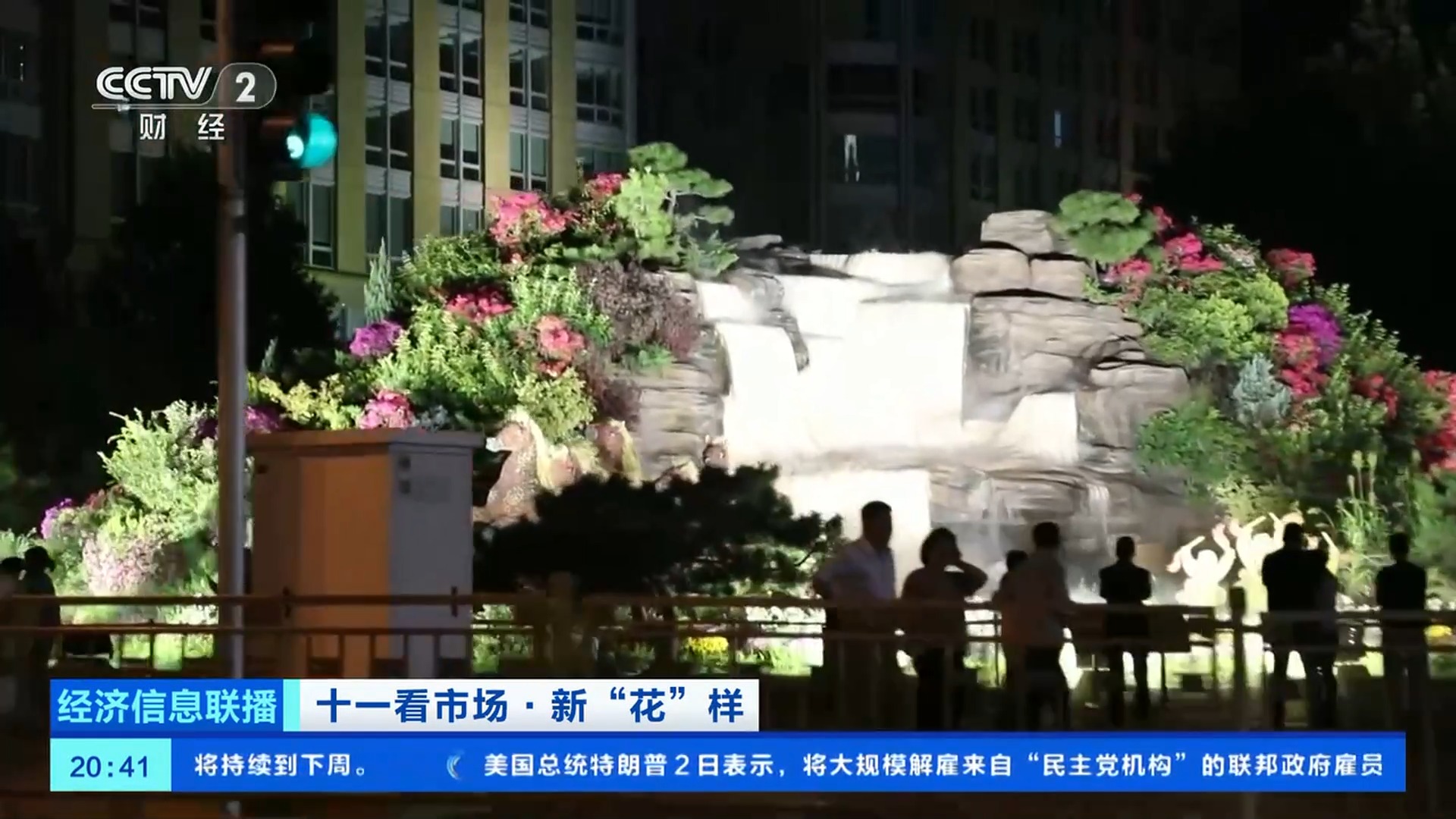 總臺央視記者 王聞聰:今年北京天安門廣場中心花壇的大花籃和長安街沿線的10組立體花壇,都在國慶中秋假期增添了夜間照明設(shè)施,讓夜晚的花壇更加引人注目。北京東單東南角的“黃河贊歌”立體花壇,也被稱為是“會唱歌的花壇”。在花壇上不僅能看到微觀的壺口瀑布、奔騰的駿馬、載歌載舞的人群,還有水霧、音樂等聲光電技術(shù),更加逼真地還原了黃河之水天上來的氣勢。晚上八點(diǎn),這里仍有大量游客前來拍照打卡。