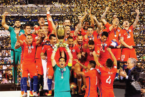 6月26日,智利隊門將布拉沃(前左一)在頒獎儀式上捧杯慶祝奪冠。當日,2016年百年美洲杯決賽在美國新澤西舉行,智利隊與阿根廷隊在120分鐘內0比0戰(zhàn)平,智利隊在點球大戰(zhàn)中以4比2戰(zhàn)勝阿根廷隊,奪得冠軍。
