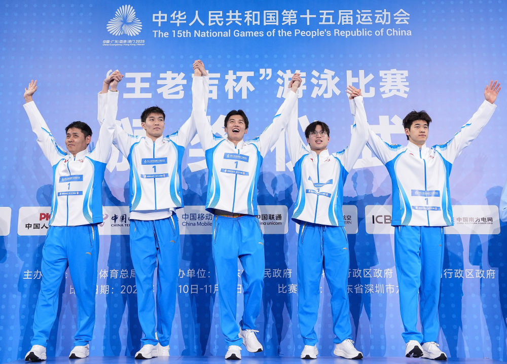 11月10日,冠軍浙江隊選手和教練在頒獎儀式上。當(dāng)日,第十五屆全國運動會游泳項目男子4X100米自由泳接力決賽在深圳舉行。新華社記者 杜宇 攝
