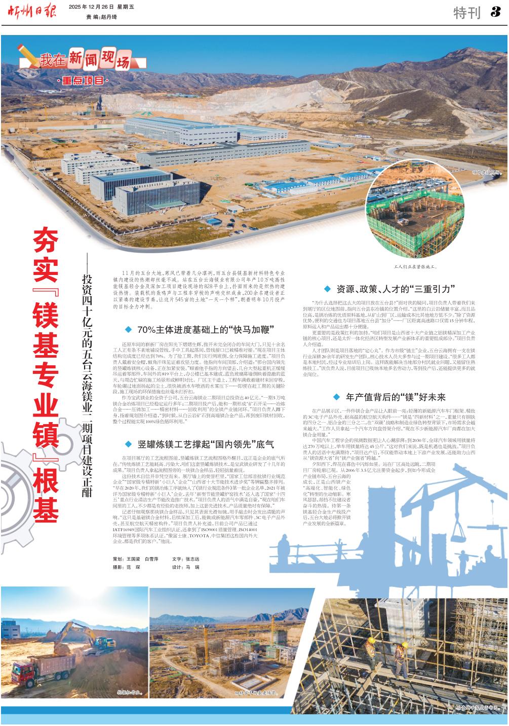 夕陽西下,焊花在暮色中閃爍如星。站在廠區(qū)高處遠(yuǎn)眺,二期項(xiàng)目廠房輪廓已現(xiàn)。從2006年3.5億元注冊資金起步,到如今形成全產(chǎn)業(yè)鏈布局,五臺云海的成長,正是山西鎂產(chǎn)業(yè)“高端化、智能化、綠色化”轉(zhuǎn)型的生動縮影。寒風(fēng)瑟瑟,卻擋不住建設(shè)者奮斗的熱情。待第一條鎂基輕合金生產(chǎn)線投產(chǎn)后,五臺大地必將掀開鎂產(chǎn)業(yè)發(fā)展的全新篇章。