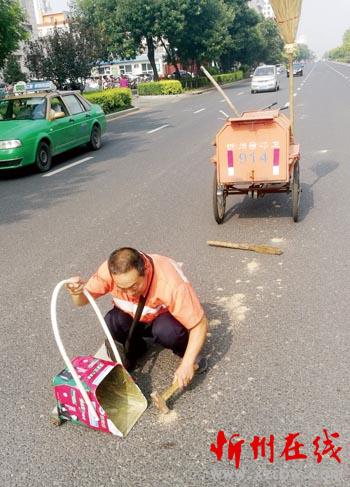 7月22日中午,忻州城區(qū)和平街,烈日當頭,車水馬龍。這時記者看到在忻州師范學(xué)院路段,一位環(huán)衛(wèi)工人手執(zhí)小鐵錘,一絲不茍蹲在馬路上敲打撒落在路面上的粘泥,然后再用掃帚認真清理干凈。這種敬業(yè)精神,值得大家學(xué)習。(赫在榮 攝)