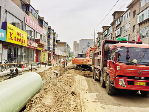 因為氣巷南巷路面較窄,地下雨水和污水管線的施工采用的是同槽開挖下埋。溝槽深度4米、寬度3.5米,雨水管線采用直徑分別為0.8米和1.2米的玻璃夾砂鋼管,污水管線采用直徑為50厘米的玻璃夾砂鋼管。為了安全,施工隊將開槽、下管和回填同步進(jìn)行。