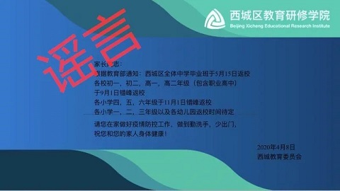 近日,“北京高三4月27日開學,六年級和初三5月11日開學” 、“西城區(qū)全體中學畢業(yè)班5月15日返?!?、“北京某區(qū)教委接到通知,確認9月1日前不會復(fù)學”等一系列消息在網(wǎng)上流傳。