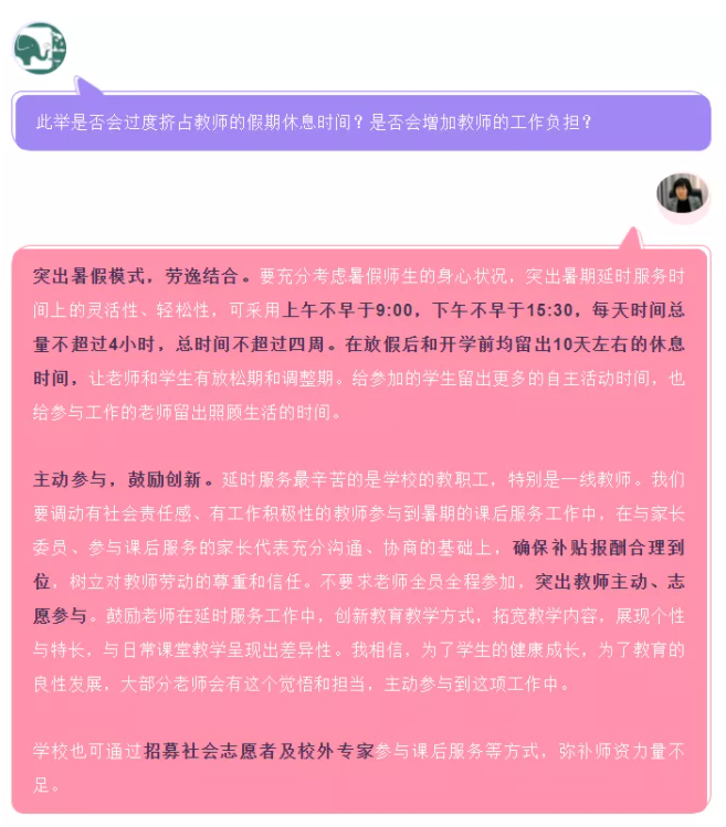 來(lái)源:北京市教育委員會(huì)官方微信公眾號(hào) 隨著北京、河南教育部門暑期托管政策的發(fā)布,暑期托管班可能會(huì)擠占老師暑期休息時(shí)間的擔(dān)憂,一時(shí)引發(fā)網(wǎng)絡(luò)熱議。基于對(duì)暑期托管政策的誤解,“北京、河南試點(diǎn)取消教師寒暑假”的不實(shí)消息因此流傳開(kāi)來(lái)。 其實(shí),暑期托管服務(wù)并非只有北京、河南開(kāi)設(shè),上海、南京、蘇州、武漢等地亦已開(kāi)展類似服務(wù),目的是解決中小學(xué)生暑期無(wú)人看管的問(wèn)題,同時(shí)又充分利用了在暑期閑置的圖書(shū)館、閱覽室、體育場(chǎng)等教育資源。