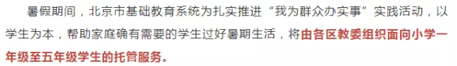 來(lái)源:河南省安陽(yáng)市教育局網(wǎng)站 6月29日,河南省鞏義市教育局印發(fā)“中小學(xué)生暑期課后服務(wù)工作”相關(guān)方案,要求鞏義市中小學(xué)校結(jié)合實(shí)際主動(dòng)承擔(dān)暑期課后服務(wù)的責(zé)任。 7月2日,北京市教育委員會(huì)表示,北京市各區(qū)教委將組織面向小學(xué)一年級(jí)至五年級(jí)學(xué)生的托管服務(wù)。