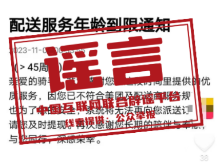真相:近日,一張“配送服務年齡到限通知”的截圖在網(wǎng)絡流傳,稱“年齡超過45歲后,就不再符合某外賣平臺及配送服務商的服務規(guī)范,系統(tǒng)將不再派送訂單”。經(jīng)向該外賣平臺核實,此信息為謠言。該平臺工作人員在接受記者采訪時稱,考慮到配送過程中相關(guān)安全因素,會對騎手的年齡限制在18周歲至57周歲之間,在此年齡范圍內(nèi),且具有完全民事行為能力和相應的獨立勞動能力,身體健康、持有有效健康證且無相關(guān)類型疾病,符合無違法犯罪記錄、熟練駕駛相關(guān)車輛等要求的人員均可注冊為網(wǎng)約配送員,網(wǎng)傳“配送員年齡上限為45歲”系虛假信息。(來源:北京網(wǎng)絡辟謠、上海網(wǎng)絡辟謠、湖北網(wǎng)絡辟謠)