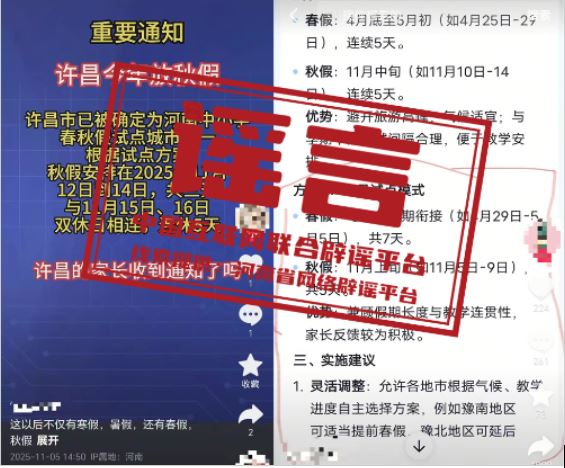 真相:近日,河南、安徽部分自媒體平臺發(fā)布關(guān)于中小學(xué)春秋放假的信息,聲稱“許昌市已被確定為河南中小學(xué)春秋假試點城市之一”“周口市中小學(xué)2025年秋假時間安排如下”“蕪湖市中小學(xué)將在11月12日至14日放首個秋假,連周末共5天”,引發(fā)關(guān)注。對此,河南許昌、周口及安徽蕪湖教育部門作出回應(yīng):并無放秋假的安排,網(wǎng)傳消息均為謠言。中小學(xué)放假安排需嚴(yán)格遵循國家教育方針政策及當(dāng)?shù)亟逃块T的統(tǒng)一部署,結(jié)合本地教育教學(xué)實際統(tǒng)籌規(guī)劃。如需了解相關(guān)安排,請通過屬地教育部門官方網(wǎng)站,切勿輕信、傳播未經(jīng)官方確認的“小道消息”。(來源:“清朗河南”微信公眾號、@大河網(wǎng)、安徽網(wǎng)絡(luò)辟謠平臺)