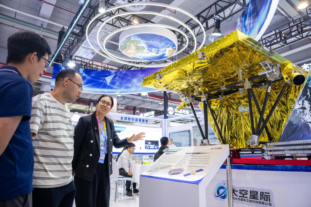 9月24日,第四屆北斗規(guī)模應(yīng)用國(guó)際峰會(huì)在湖南株洲開(kāi)幕。圖為在株洲國(guó)際會(huì)展中心,工作人員(左三)在介紹一臺(tái)對(duì)地觀(guān)測(cè)衛(wèi)星。新華社記者 陳思汗 攝