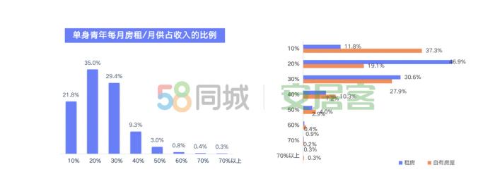 同時(shí),還有50.1%的單身青年目前租房居住,居住成本是一筆不小的支出項(xiàng),約65%的單身青年每月在房租/月供的開(kāi)銷(xiāo)占收入的20-30%。