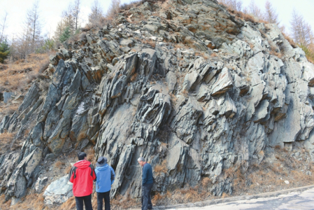 地殼深處的巖石并非靜止不動。在清水河谷的峭壁上,有一道“之”字形巖帶,這是位于地下的“韌性剪切帶”,其形成過程宛如慢動作下的“拉面條”。在地下500℃的高溫高壓環(huán)境中,巖石會逐漸變軟,如同橡皮泥般被板塊擠壓力“揉來揉去”。經(jīng)過上百萬年的拉伸,巖石形成了波浪狀褶皺,其中的白云母晶體甚至被拉長10倍,形似銀針,清晰記錄著巖石變形的強度。