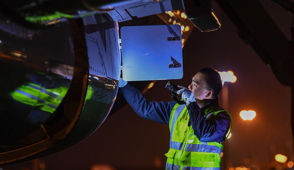 1月11日,在海口美蘭國際機(jī)場停機(jī)坪上,南航工程技術(shù)分公司機(jī)務(wù)工程師對(duì)飛機(jī)進(jìn)行深度檢查。新華社記者 楊冠宇 攝
