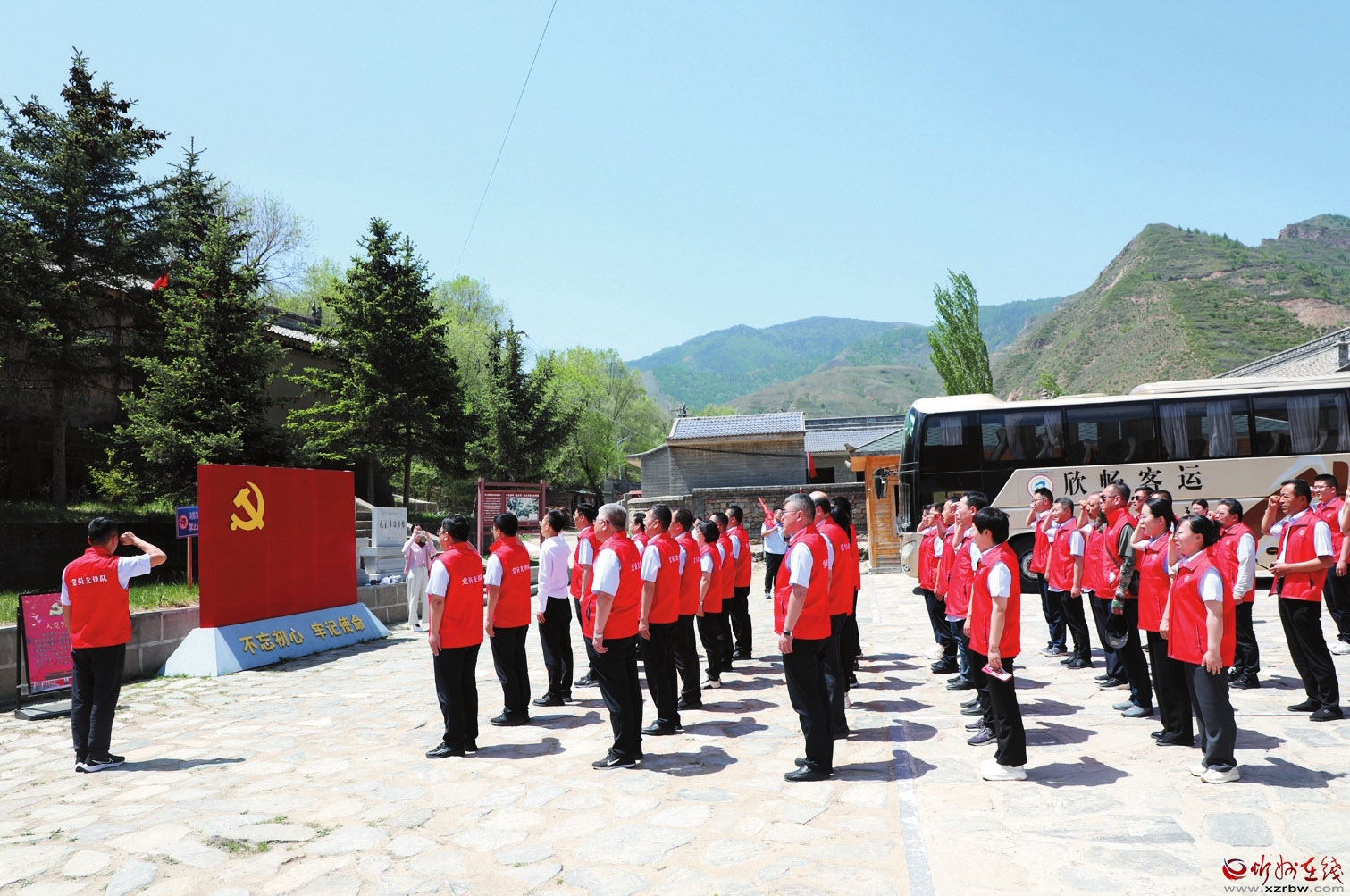 近日,農(nóng)行忻州分行機關組織全體黨員前往繁峙縣伯強村毛主席路居紀念館開展主題黨日活動。在紀念館前,全體黨員面對黨旗莊嚴宣誓,重溫入黨誓詞,接受了一次深刻的紅色教育洗禮。(王燦 攝)