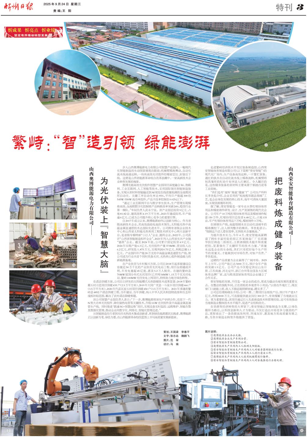 山西奧博能源電力有限公司—— 為光伏裝上“智慧大腦” 步入山西奧博能源電力有限公司智慧產(chǎn)業(yè)園內(nèi),一幅現(xiàn)代化智能制造的生動(dòng)圖景展現(xiàn)在眼前:機(jī)械臂精準(zhǔn)舞動(dòng),自動(dòng)化流水線高速運(yùn)轉(zhuǎn),一塊塊高效光伏組件經(jīng)精密層壓、封裝后下線。這便是山西省能源革命綜合改革浪潮中,一家高新技術(shù)企業(yè)轉(zhuǎn)型發(fā)展的縮影。 奧博光能高效光伏組件智慧產(chǎn)業(yè)園項(xiàng)目深度融合5G、物聯(lián)網(wǎng)、工業(yè)互聯(lián)網(wǎng)、人工智能等技術(shù),采用國(guó)際領(lǐng)先智能制造裝備,實(shí)現(xiàn)從原材料智能輸送到AI視覺(jué)在線質(zhì)量檢測(cè)的全流程閉環(huán)自動(dòng)化。關(guān)鍵工序自動(dòng)化率達(dá)95%,平均日產(chǎn)能超300塊545W/550W高功率組件,產(chǎn)品不良率控制在0.02%以下。 “通過(guò)工業(yè)互聯(lián)網(wǎng)平臺(tái)與數(shù)字孿生技術(shù),生產(chǎn)管理實(shí)現(xiàn)精準(zhǔn)高效,全流程數(shù)字化控制使產(chǎn)品轉(zhuǎn)換效率突破24%,穩(wěn)居行業(yè)第一梯隊(duì)?!避?chē)間負(fù)責(zé)人武永寧說(shuō)。該產(chǎn)業(yè)園總投資5億元、占地81.82畝、建筑面積4.19萬(wàn)平方米,2023年建成投用,年產(chǎn)值逾6億元,已成為公司提升核心競(jìng)爭(zhēng)力的重要引擎。 自2017年成立以來(lái),奧博能源始終以創(chuàng)新為核心。作為省級(jí)高新技術(shù)企業(yè),其高效晶硅電池技術(shù)領(lǐng)先,太陽(yáng)能光熱中高溫金屬直通管技術(shù)達(dá)國(guó)際先進(jìn)水平。公司擁有省級(jí)企業(yè)技術(shù)中心和山西省太陽(yáng)能光熱利用工程技術(shù)研究中心兩大創(chuàng)新平臺(tái),是省級(jí)專(zhuān)精特新“小巨人”企業(yè)、瞪羚企業(yè),2022年,公司獲評(píng)“山西省智能制造標(biāo)桿企業(yè)”,2023年列入山西省光伏產(chǎn)業(yè)鏈“鏈核”企業(yè)。截至2024年底,公司累計(jì)固定投資4.9億元。2024年實(shí)現(xiàn)產(chǎn)值6.3億元,光伏組件產(chǎn)量373MW,營(yíng)業(yè)收入達(dá)6.2億元,研發(fā)投入875萬(wàn)元,實(shí)現(xiàn)利潤(rùn)0.75億元,利稅總額1.1億元。產(chǎn)業(yè)園內(nèi)年產(chǎn)能20萬(wàn)支的中高溫金屬直通管生產(chǎn)線,使公司成為行業(yè)內(nèi)首個(gè)同時(shí)具備光伏、光熱核心組件制造能力的新能源基地。 在產(chǎn)業(yè)扶貧與鄉(xiāng)村振興方面,公司自2018年起承接建設(shè)總?cè)萘拷?0萬(wàn)千瓦的產(chǎn)業(yè)扶貧光伏電站工程,項(xiàng)目全部建成并網(wǎng),年發(fā)電量超45億度,惠及5.2萬(wàn)人脫貧。在建的繁峙縣70MW屋頂分布式光伏項(xiàng)目(已并網(wǎng)54MW)、15萬(wàn)千瓦光伏電站、繁峙100MW光伏發(fā)電上網(wǎng)項(xiàng)目,持續(xù)助力地方綠色轉(zhuǎn)型。在清潔供暖方面,公司自主研發(fā)的太陽(yáng)能槽式光熱取暖技術(shù)成果顯著:2018年繁峙雁頭村示范項(xiàng)目供暖435戶(hù)(2.5萬(wàn)平方米),2019年大同廣靈縣一斗泉鄉(xiāng)項(xiàng)目供暖666戶(hù)(3.5萬(wàn)平方米),2020年代縣瓦窯頭村項(xiàng)目供暖450戶(hù)(3.5萬(wàn)平方米)。2021年承建的繁峙縣4852戶(hù)清潔供暖工程,當(dāng)年建設(shè)、當(dāng)年供暖,納入中華人民共和國(guó)財(cái)政部和生態(tài)環(huán)境部補(bǔ)貼范圍,解決了農(nóng)村清潔取暖難題。 該公司智慧產(chǎn)業(yè)園負(fù)責(zé)人表示:“下一步,奧博能源將深化產(chǎn)學(xué)研合作,攻堅(jiān)下一代N型大功率光伏組件、砷化鎵熱電管等關(guān)鍵技術(shù),升級(jí)1GW光伏組件及中高溫金屬直通管生產(chǎn)線。同時(shí)推進(jìn)‘聯(lián)通5G+智慧運(yùn)維’項(xiàng)目,實(shí)現(xiàn)設(shè)備實(shí)時(shí)監(jiān)控、遠(yuǎn)程維護(hù)、智能告警及數(shù)據(jù)化管理,推動(dòng)企業(yè)向數(shù)字化、網(wǎng)絡(luò)化、智能化管理邁進(jìn)。” 從智能制造先行者到光伏光熱技術(shù)集成創(chuàng)新者,再到綠色能源惠民實(shí)踐者,奧博能源正以創(chuàng)新為筆、綠色為墨,在山西能源革命綜改藍(lán)圖上書(shū)寫(xiě)高質(zhì)量發(fā)展新篇章。 山西榮安智能體育制造有限公司—— 把廢料煉成健身裝備 走進(jìn)繁峙經(jīng)濟(jì)技術(shù)開(kāi)發(fā)區(qū)裝備制造園,山西榮安智能體育制造有限公司(以下簡(jiǎn)稱(chēng)“榮安智能”)的現(xiàn)代化廠房?jī)?nèi),生產(chǎn)設(shè)備高效運(yùn)轉(zhuǎn),一片繁忙景象。通紅的鐵水在自動(dòng)化流水線上精準(zhǔn)流轉(zhuǎn),機(jī)械臂將初具雛形的杠鈴片有序送入打磨區(qū)。令人矚目的是,這些健身裝備的原材料主要來(lái)源于鋼渣污泥等工業(yè)固廢。 “我們是用‘廢料’煉就‘健康’!”公司生產(chǎn)科科長(zhǎng)李世彪介紹,企業(yè)采用的“短流程雙聯(lián)法熔煉”工藝,是企業(yè)綠色發(fā)展的核心技術(shù),每年可消納大量固廢,實(shí)現(xiàn)資源循環(huán)利用。 據(jù)了解,榮安智能是一家專(zhuān)業(yè)從事杠啞鈴體育用品和精密鑄件研發(fā)、設(shè)計(jì)、生產(chǎn)及銷(xiāo)售的現(xiàn)代化企業(yè)。公司年產(chǎn)10萬(wàn)噸杠啞鈴體育用品及精密鑄件配套150萬(wàn)件,杠啞鈴項(xiàng)目總投資4.48億元,占地135畝,年產(chǎn)杠啞鈴體