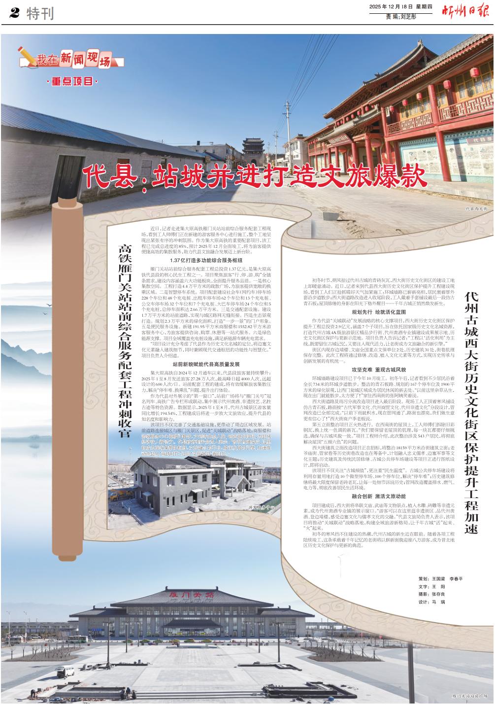 作為代縣對(duì)外展示的“第一窗口”,站前廣場(chǎng)將與“雁門關(guān)號(hào)”冠名列車、高鐵廣告專欄形成聯(lián)動(dòng),集中展示代州黃酒、非遺技藝、名勝古跡等特色資源。數(shù)據(jù)顯示,2025年1至8月,代州古城景區(qū)游客量同比增長(zhǎng)194.54%,工程建成后將進(jìn)一步放大文旅效應(yīng),提升代縣的知名度和影響力。