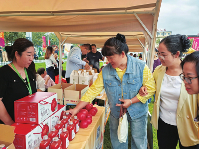 臺(tái)上歡歌快舞慶豐收,臺(tái)下熱熱鬧鬧逛大集。產(chǎn)品展銷現(xiàn)場(chǎng),人頭攢動(dòng)、熱鬧非凡,游客品嘗豐收美食、體驗(yàn)豐收喜悅。售賣農(nóng)產(chǎn)品的農(nóng)民嗓門大、笑容甜:“郊區(qū)西南舁的蘋果,嘎啦脆,您嘗嘗!”“平定的黃瓜干,好吃,有嚼勁!”“今天剛從地里摘的老南瓜,又糯又甜!”“家里走地雞下的蛋,特別香!”