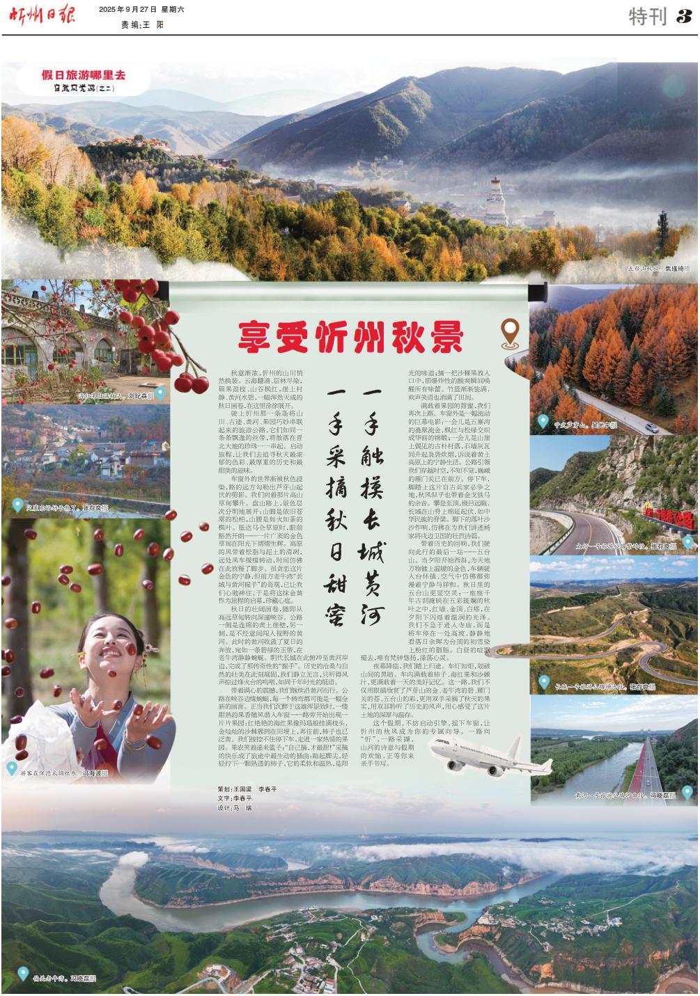 一手采摘秋日甜蜜 一手觸摸長(zhǎng)城黃河 秋意漸濃,忻州的山川悄然換裝。云海翻涌、層林盡染,碩果盈枝、山谷楓紅,崖上村靜、黃河水碧,一幅渾然天成的秋日畫(huà)卷,在這里徐徐展開(kāi)。 駛上忻州那一條條將山川、古跡、黃河、果園巧妙串聯(lián)起來(lái)的旅游公路,它們?nèi)缤粭l條飄逸的絲帶,將散落在晉北大地的珍珠一一串起。啟動(dòng)旅程,讓我們?nèi)プ穼で锾熳顫庥舻纳?、最厚重的歷史和最甜美的滋味。 車(chē)窗外的世界漸被秋色浸染,路的遠(yuǎn)方勾勒出蘆芽山起伏的剪影。我們向著那片高山草甸攀升。盤(pán)山路上,景色層次分明地展開(kāi):山腳是依舊蒼翠的松柏,山腰是如火如荼的楓葉。抵達(dá)馬侖草原時(shí),眼前豁然開(kāi)朗——一片廣袤的金色草甸在陽(yáng)光下熠熠生輝。高原的風(fēng)帶著松脂與泥土的清冽,遠(yuǎn)處風(fēng)車(chē)緩緩轉(zhuǎn)動(dòng),時(shí)間仿佛在此放慢了腳步。雖貪戀這片金色的寧?kù)o,但前方老牛灣“長(zhǎng)城與黃河握手”的奇觀,已讓我們心馳神往,于是將這抹金黃作為旅程的啟幕,珍藏心底。 秋日的壯闊畫(huà)卷,隨即從高遠(yuǎn)草甸轉(zhuǎn)向深邃峽谷。公路一側(cè)是連綿的黃土崖壁,另一側(cè),是不經(jīng)意間闖入視野的黃河。此時(shí)的黃河收斂了夏日的奔放,宛如一條碧綠的玉帶,在老牛灣靜靜蜿蜒。明代長(zhǎng)城在此俯沖至黃河岸邊,完成了那傳奇性的“握手”。歷史的滄桑與自然的壯美在此刻凝固,我們靜立無(wú)言,只聽(tīng)得風(fēng)聲掠過(guò)烽火臺(tái)的嗚咽,如同千年時(shí)光的低語(yǔ)。 帶著滿(mǎn)心的震撼,我們繼續(xù)沿黃河而行。公路在峽谷邊緣蜿蜒,每一個(gè)轉(zhuǎn)彎都可能是一幅全新的畫(huà)面。正當(dāng)我們沉醉于這雄渾景致時(shí),一縷甜熟的果香隨風(fēng)潛入車(chē)窗——路旁開(kāi)始出現(xiàn)一片片果園:紅艷艷的海紅果像瑪瑙般掛滿(mǎn)枝頭,金燦燦的沙棘簇?fù)碓谔锕∩?,再往前,柿子也已泛黃。我們按捺不住停下車(chē),走進(jìn)一家熱情的果園。果農(nóng)笑著遞來(lái)籃子:“自己摘,才最甜!”采摘的快樂(lè)成了旅途中最生動(dòng)的插曲:踮起腳尖,輕輕擰下一顆熟透的柿子,它的柔軟和溫?zé)?,是?yáng) 光的味道;摘一把沙棘果放入口中,那爆炸性的酸爽瞬間喚醒所有味蕾。竹籃漸漸裝滿(mǎn),歡聲笑語(yǔ)也灑滿(mǎn)了田間。 滿(mǎn)載著果園的甜蜜,我們?cè)俅紊下贰\?chē)窗外是一幅流動(dòng)的巨幕電影:一會(huì)兒是五寨溝的疊翠流金,楓紅與松綠交織成華麗的錦緞;一會(huì)兒是山崖上偶見(jiàn)的古樸村落,石墻灰瓦間升起裊裊炊煙,訴說(shuō)著黃土高原上的寧?kù)o生活。公路引領(lǐng)我們穿越時(shí)空,不知不覺(jué),巍峨的雁門(mén)關(guān)已在前方。停下車(chē),腳踏上這片自古兵家必爭(zhēng)之地,秋風(fēng)似乎也帶著金戈鐵馬的余音。攀登至頂,極目遠(yuǎn)眺,長(zhǎng)城在山脊上綿延起伏,如中華民族的脊梁。腳下的落葉沙沙作響,仿佛在為我們講述楊家將戍邊衛(wèi)國(guó)的壯烈詩(shī)篇。 帶著歷史的回響,我們駛向此行的最后一站——五臺(tái)山。當(dāng)夕陽(yáng)開(kāi)始西斜,為天地萬(wàn)物鍍上溫暖的金色,車(chē)輛駛?cè)肱_(tái)懷鎮(zhèn),空氣中仿佛都彌漫著寧?kù)o與祥和。秋日里的五臺(tái)山更顯空靈:一座座千年古剎掩映在五彩斑斕的秋葉之中,紅墻、金頂、白塔,在夕陽(yáng)下閃爍著溫潤(rùn)的光澤。我們不急于進(jìn)入寺廟,而是將車(chē)停在一處高坡,靜靜地看落日余暉為臺(tái)頂?shù)某跹┤旧戏奂t的胭脂。白晝的喧囂褪去,唯有梵鐘悠揚(yáng),滌蕩心靈。 夜幕降臨,我們踏上歸途。車(chē)燈如炬,劃破山間的黑暗。車(chē)內(nèi)滿(mǎn)載著柿子、海紅果和沙棘汁,更滿(mǎn)載著一天的美好記憶。這一路,我們不僅用眼睛欣賞了蘆芽山的金、老牛灣的碧、雁門(mén)關(guān)的蒼、五臺(tái)山的彩,更用雙手采摘了秋天的果實(shí),用雙耳聆聽(tīng)了歷史的風(fēng)聲,用心感受了這片土地的深厚與溫存。 這個(gè)假期,不妨啟動(dòng)引擎,搖下車(chē)窗,讓忻州的秋風(fēng)成為你的專(zhuān)屬向?qū)?。一路向“忻”,一路采擷,山河的詩(shī)意與假期的歡愉,正等你來(lái)親手書(shū)寫(xiě)。 策劃:王國(guó)梁 李春平 文字:李春平 設(shè)計(jì):馬瑞 (責(zé)任編輯:盧相汀) |