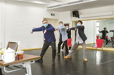 雖然疫情正在向好,但防控的弦還不能就此放松下來。整個(gè)藝苑大樓彌漫著消毒水的味道,演員們都戴著口罩,分散在排練廳、會議室、演員隊(duì)等各個(gè)角落進(jìn)行排練。