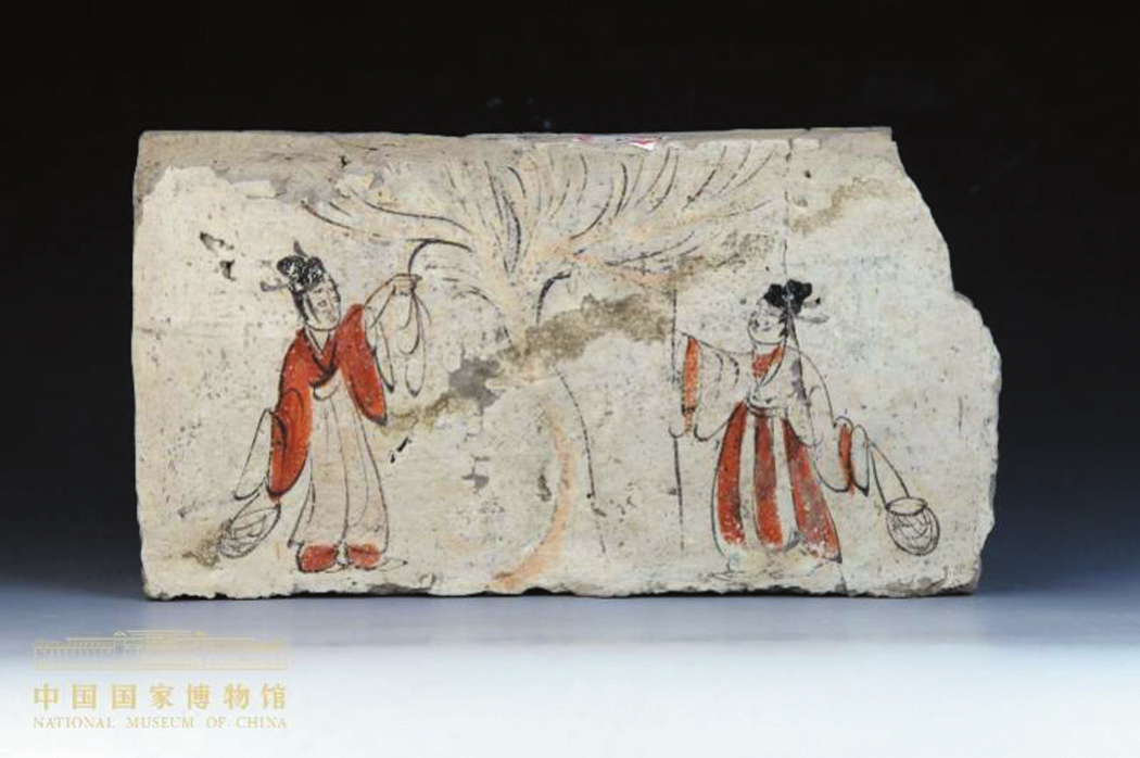 魏晉時期女子多以襦配裙。一塊高臺縣博物館藏的畫像磚,畫面中間繪著一棵繁茂桑樹,樹下左右各立一女在采桑。左側女子上半身微向后仰,著紅色襦衣,下穿白裙,露出履尖,右臂下垂,手拎?;\,左臂向上揚,攀住桑枝正在采葉;右側女子則著白色襦衣,下穿紅白條紋相間的裙子,也露出履尖,右手持桑鉤采桑,左手提?;\。兩名女子的寬袖與裙擺隨其勞作而翩然拂動,展現出微風中的自然動態(tài),頗有魏晉時期繪畫的特色。
