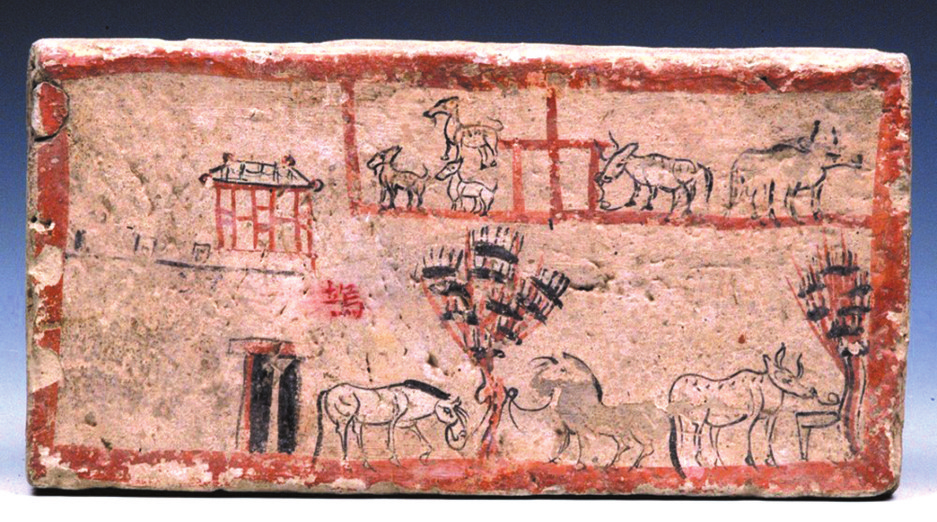 塢壁是東漢時期極具特色的建筑,由于當時地方豪強勢力急速發(fā)展,廣泛兼并土地,蔭庇宗族與賓客,形成自己的武裝與生產力量,逐漸出現了塢、屯、壁、堡、壘、營、寨等集生產、生活、軍事為一體的建筑,閉門成市,后來在魏晉時期發(fā)揚光大。嘉峪關長城博物館藏的一塊畫像磚,磚面左側繪一小城,城墻上筑雉堞,城門上建譙樓,榜題“塢”字,塢外繪有兩株樹,還有一群牛馬羊在悠閑吃草,形象再現了塢的建筑形制。