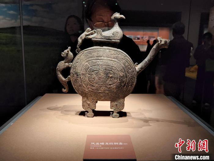觀眾在展覽現(xiàn)場欣賞鳳蓋蟠龍紋銅盉。趙曉 攝