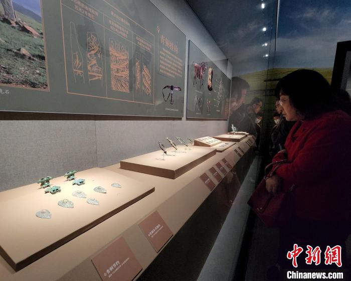 記者在展廳內(nèi)看到,眾多青銅制品以動物形象為裝飾題材,猛虎、野狼、駿馬、鷹隼等姿態(tài)奔放、形象生動,折射游牧民族對生命力的崇拜。