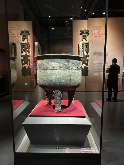 據首都博物館提供的資料顯示,該展品為商代青銅器,高約86cm,口徑61cm。鼎體呈直耳、深腹、柱足中空造型,胎壁輕薄,口沿下與足部裝飾單層獸面紋,足部設扉棱。