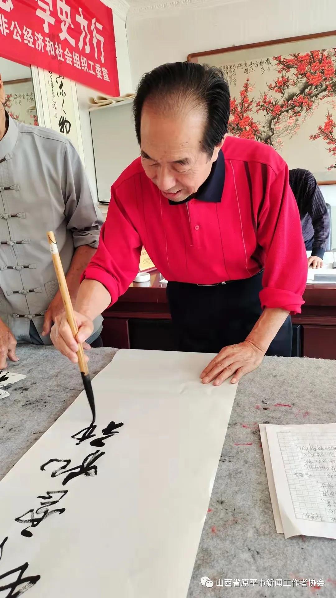 活動(dòng)現(xiàn)場(chǎng),大家暢所欲言,紛紛聯(lián)系思想實(shí)際,交流了學(xué)習(xí)黨史、明理知進(jìn)的心得體會(huì),圍繞學(xué)史長(zhǎng)知、學(xué)史明理、學(xué)史增信、學(xué)史興業(yè)進(jìn)行了熱烈討論。接著,書(shū)畫(huà)藝術(shù)組的書(shū)法家亢銀中、趙存仁、王玉伍、張正山、王福歲、王弘新,及學(xué)會(huì)顧問(wèn)書(shū)畫(huà)名家溫樹(shù)森老師、以及特邀書(shū)畫(huà)名家李晉復(fù)先生,紛紛揮毫潑墨,書(shū)寫(xiě)出學(xué)習(xí)黨史的感悟與名言。大筆揮灑中,一幅幅寫(xiě)有“賡續(xù)精神血脈、傳承紅色基因”“明理增信.崇德力行”“不忘初心、牢記使命”和“江山就是人民、人民就是江山”等字樣的真、草、隸、篆、行書(shū)藝作品,從筆下飄然而出。墨香中呈現(xiàn)出各有千秋、韻味感人的風(fēng)格,博得觀賞者們的點(diǎn)贊稱(chēng)道,并爭(zhēng)相拿到一幅贈(zèng)品。書(shū)法家們顧不上喝水,整整忙了一個(gè)上午。特別是書(shū)畫(huà)藝術(shù)組組長(zhǎng)李文光,由于平時(shí)在廣州忙于接送孩子上學(xué),放暑假回原平后特地趕來(lái),高興地跟大家一起切磋書(shū)藝、展示才藝。書(shū)法家們還探討了書(shū)法藝術(shù)融入社會(huì)、融入黨性、服務(wù)大眾、服務(wù)中心的蹊徑、舉措與打算。(賈宣生 王福歲)