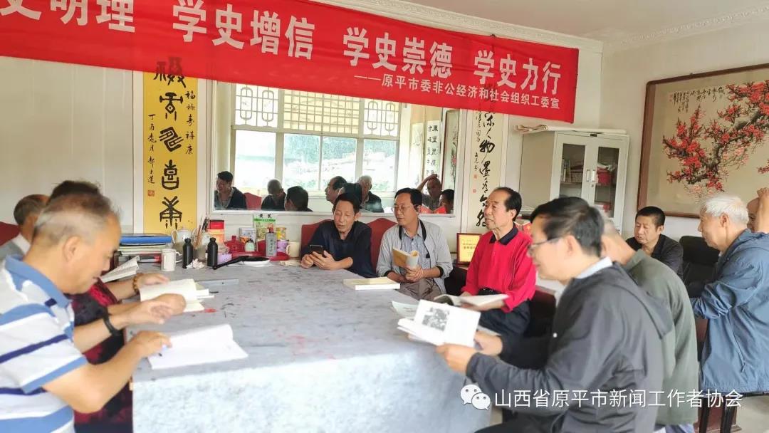 近日,原平市老年新聞文化學(xué)會(huì)組織開(kāi)展了一次以學(xué)黨史悟思想為主旨的專(zhuān)題筆會(huì)活動(dòng)。學(xué)會(huì)會(huì)長(zhǎng)楊?lèi)?ài)英、學(xué)會(huì)黨支部書(shū)記劉興良跟學(xué)會(huì)書(shū)畫(huà)藝術(shù)組成員一起,在這秋高氣爽、陽(yáng)光燦爛的日子里,以滿(mǎn)腔熱情來(lái)到學(xué)會(huì)辦公中心柳巷牡丹園,參加了這一集研討和書(shū)法于一體的別開(kāi)生面的活動(dòng)。學(xué)會(huì)文化合作單位增壽口腔、金色童年、萬(wàn)源石雕與奶爸奶媽等單位人員,以及部分書(shū)畫(huà)愛(ài)好者共近50人,共同分享了書(shū)藝交流的喜悅。