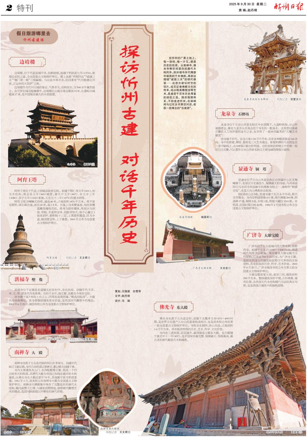 在忻州的廣袤土地上,每一塊磚、每一片瓦,都是歷史的低語。從南禪寺、佛光寺榫卯間留存的唐代木構(gòu)風華,到洪福寺宋代雕塑中凝固的千年佛韻,再到邊靖樓“威鎮(zhèn)三關(guān)”的明代雄姿……這些古建似時空的切片,或見證著佛教文化的傳承,或以精美雕塑詮釋藝術(shù),是感受千百年歷史厚重的絕佳之選。國慶假期將至,不妨走進忻州,在凝眸間與過往歲月隔空對話,收獲一段難忘的“古建游”。