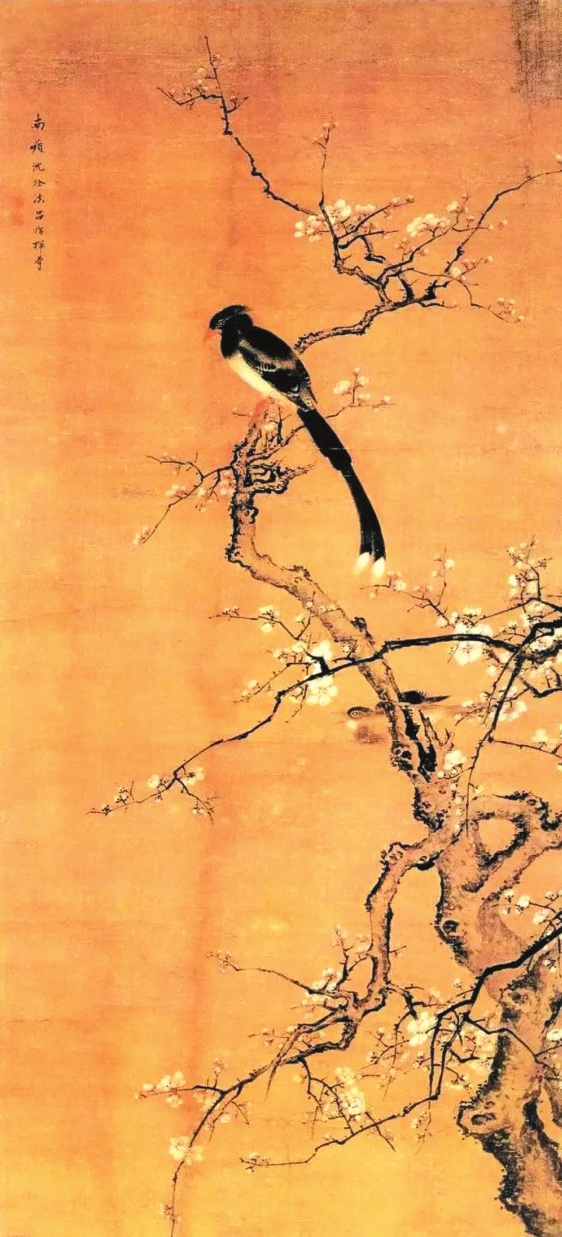 宋代畫家筆下的梅花大都與禽鳥有所關(guān)聯(lián),這主要得益于花鳥畫在此時(shí)的繁盛之勢(shì)。宋徽宗趙佶的《臘梅山禽圖》就把梅花與白頭翁聯(lián)系起來,描繪了在乍暖還寒的季節(jié)里,兩只相伴而生的白頭翁立于臘梅枝頭的場(chǎng)景,給觀者帶來復(fù)蘇之感。作品左下角題詩(shī)“山禽矜逸態(tài),梅粉弄輕柔。已有丹青約,千秋指白頭”,表達(dá)了愛情之思。因?yàn)榘最^翁在傳統(tǒng)文化中象征吉祥與幸福,是對(duì)白頭偕老的隱喻,當(dāng)它與梅花結(jié)合起來時(shí),便會(huì)強(qiáng)化人們對(duì)美好愛情的聯(lián)想。