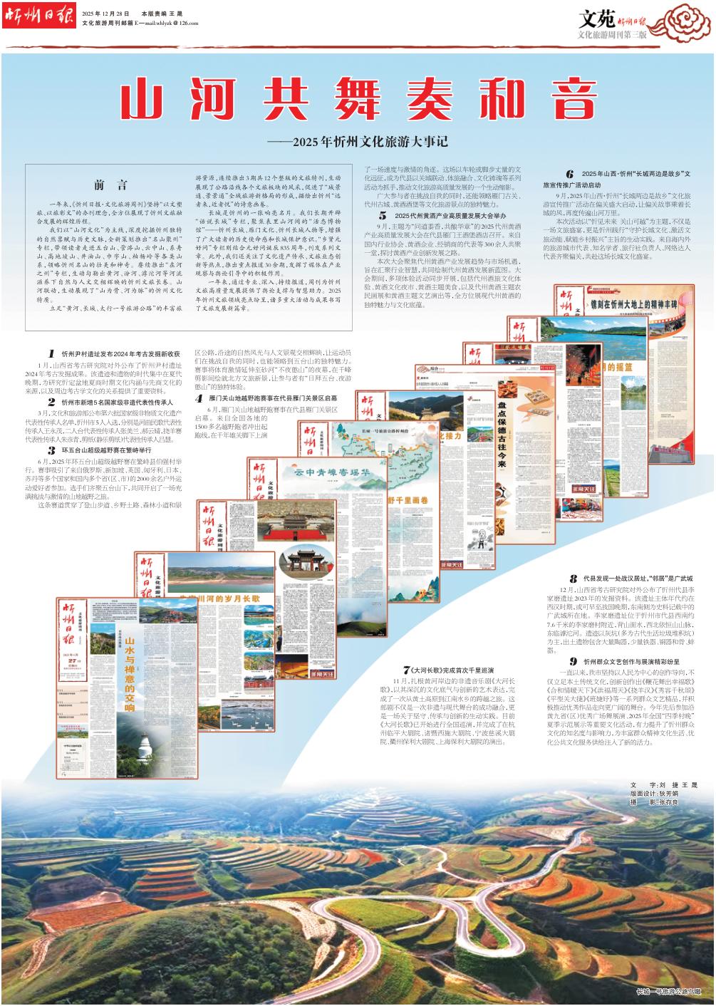 一年來,通過專業(yè)、深入、持續(xù)報道,周刊為忻州文旅高質量發(fā)展提供了輿論支撐與智慧助力。2025年忻州文旅領域亮點紛呈,諸多重大活動與成果書寫了文旅發(fā)展新篇章。