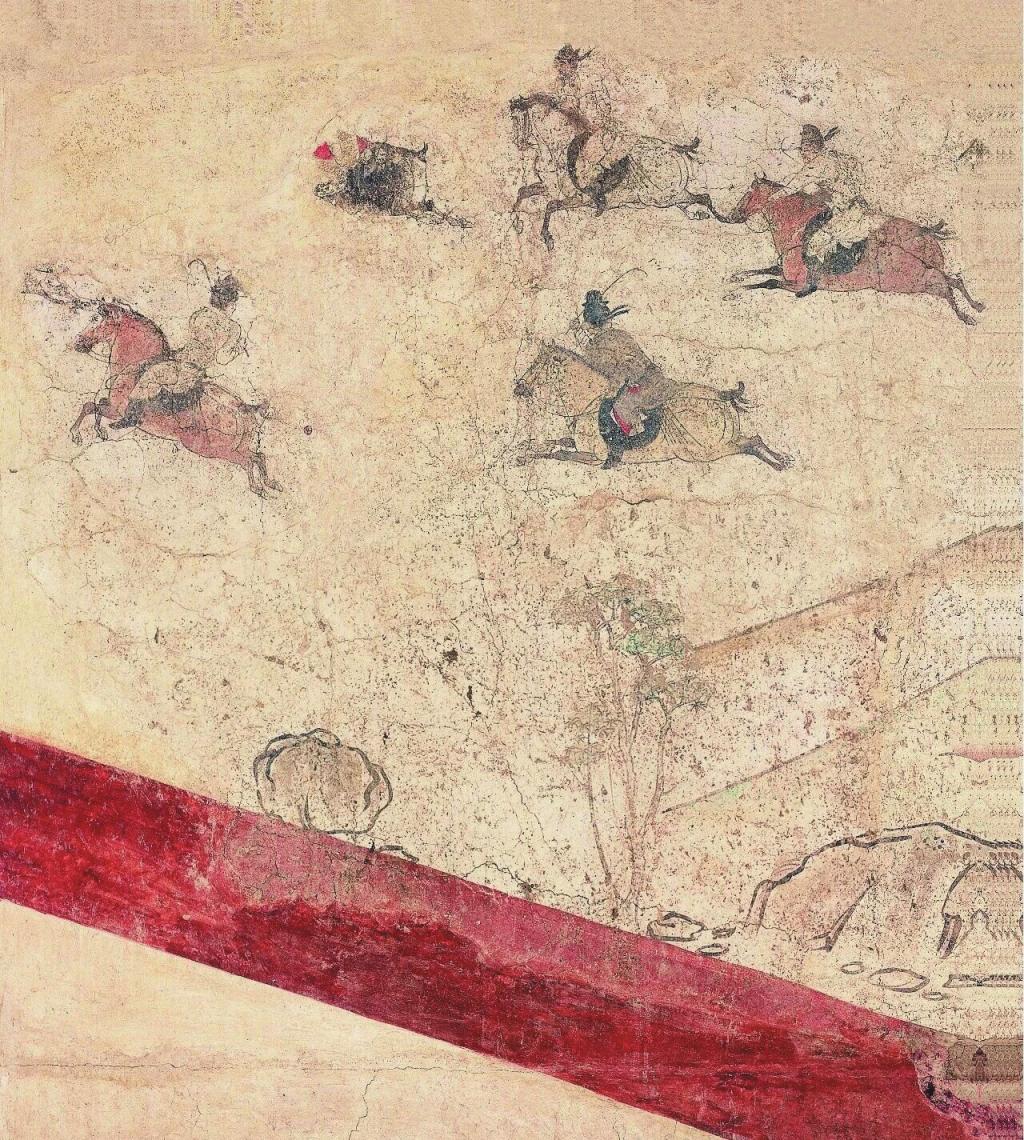 初唐淮安王李壽墓墓道東壁的《備馬出行圖》中,42匹青、灰、白、紅、褐各色交織的駿馬昂首闊步,馬上騎士手持紅旗,相互顧盼,一派王公貴胄儀仗出行的煊赫氣象;盛唐章懷太子李賢墓道西壁的《馬球圖》,20余騎馳騁如風(fēng),青山古樹為幕,馬蹄翻飛間盡顯“神駿追風(fēng)”的活力……這些定格在墻壁上的身影,不僅是唐代繪畫藝術(shù)的瑰寶,更是一扇窺見唐人生活脈搏的窗口。