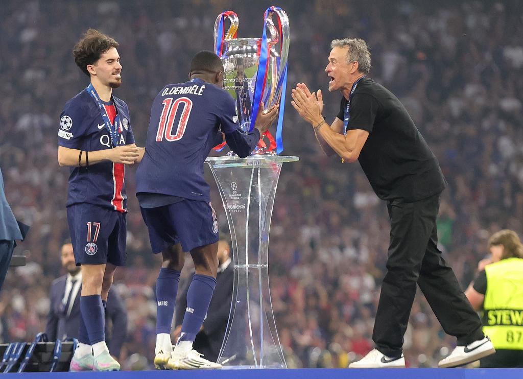 5月31日,巴黎圣日耳曼隊(duì)主教練恩里克(右)與球員登貝萊(中)、維蒂尼亞慶祝。當(dāng)日,在德國(guó)慕尼黑進(jìn)行的2024-2025賽季歐冠聯(lián)賽決賽中,法甲巴黎圣日耳曼隊(duì)5比0擊敗意甲國(guó)際米蘭隊(duì),收獲隊(duì)史第一座歐冠冠軍獎(jiǎng)杯。新華社發(fā)(菲利普·魯伊茲攝)