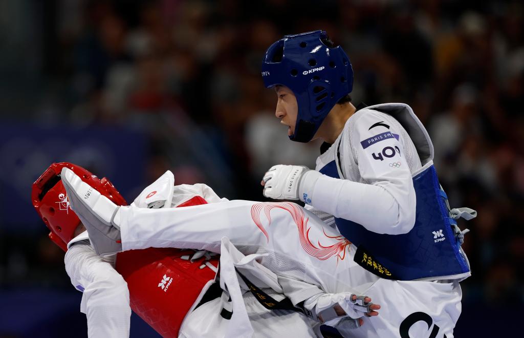 2024年8月8日,中國選手梁育帥(右)在巴黎奧運(yùn)會跆拳道男子68公斤級16強(qiáng)賽上。新華社記者 費(fèi)茂華 攝