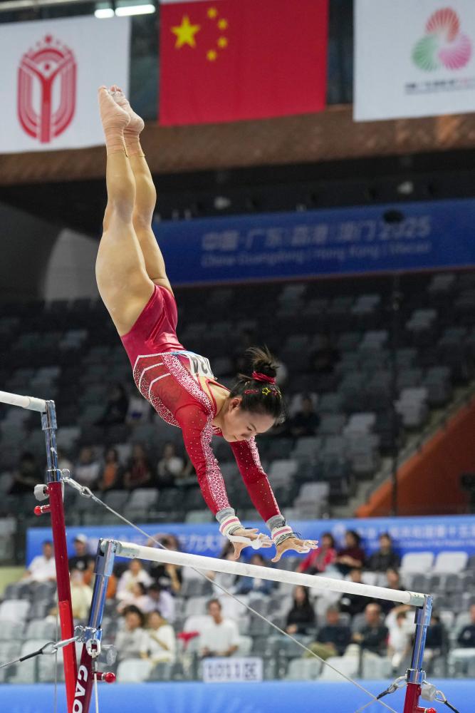 11月13日,浙江隊選手張清穎在高低杠比賽中。新華社記者 胥冰潔 攝