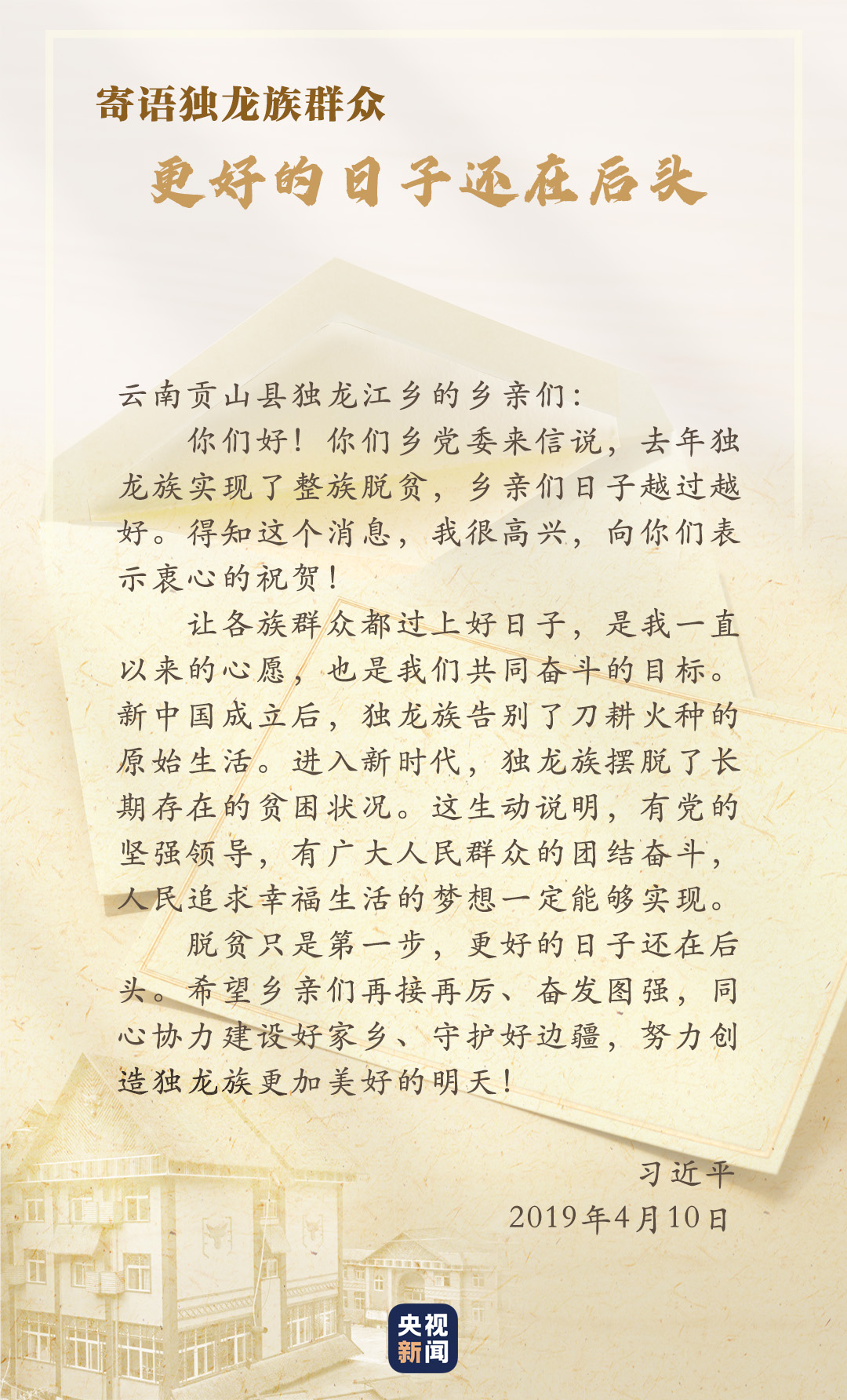 2018年,獨龍江鄉(xiāng)6個行政村整體脫貧,獨龍族實現(xiàn)整族脫貧,基礎設施、特色產(chǎn)業(yè)、社會事業(yè)等都發(fā)生了巨大變化。貢山縣干部群眾再次給習近平寫信匯報脫貧成績,習近平得知后非常高興,向他們表示“衷心的祝賀”,并勉勵鄉(xiāng)親們?yōu)檫^上更加幸福美好的生活繼續(xù)團結(jié)奮斗。