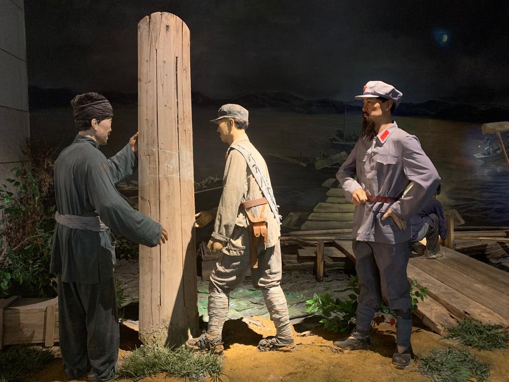 △中央紅軍出發(fā)紀念館再現(xiàn)于都老人將自己的棺木捐給紅軍搭浮橋的場景。(總臺央視記者郭晗光拍攝)
