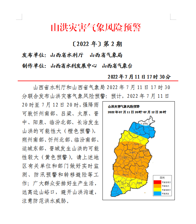 山西省水利廳和山西省氣象局2022年7月11日17時(shí)30分聯(lián)合發(fā)布山洪災(zāi)害氣象風(fēng)險(xiǎn)預(yù)警:預(yù)計(jì),2022年7月11日20時(shí)至7月12日20時(shí),強(qiáng)降雨可致忻州南部、呂梁、太原、晉中、陽泉、臨汾北部、長治發(fā)生山洪的可能性大(橙色預(yù)警),朔州南部、忻州北部、臨汾南部、運(yùn)城東部、晉城發(fā)生山洪的可能性較大(黃色預(yù)警)。