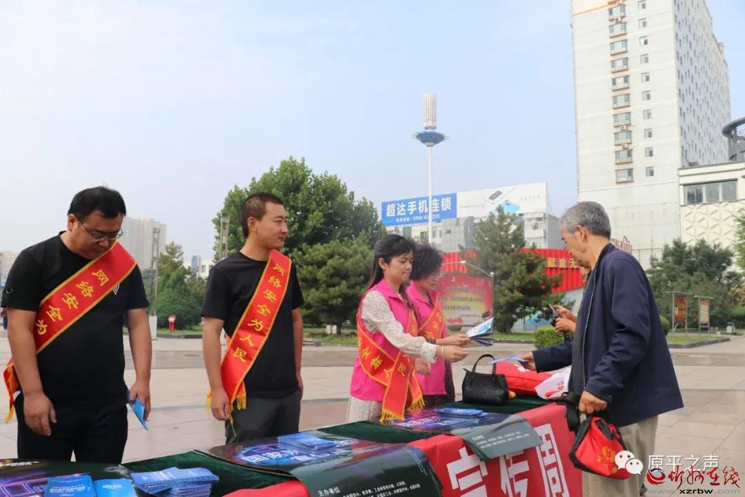 9月14日上午,原平市委宣傳部、市委網(wǎng)信辦、市公安局、市教科局、市工信局、團(tuán)市委、市婦聯(lián)、中國人民銀行等單位聯(lián)合在街心廣場開展集中宣傳,向市民發(fā)放宣傳資料。同時,工作人員還走到街頭向過往群眾講解網(wǎng)絡(luò)安全基礎(chǔ)知識、個人信息保護(hù)等知識,極大地調(diào)動廣大群眾參與網(wǎng)絡(luò)安全防護(hù)活動的熱情。