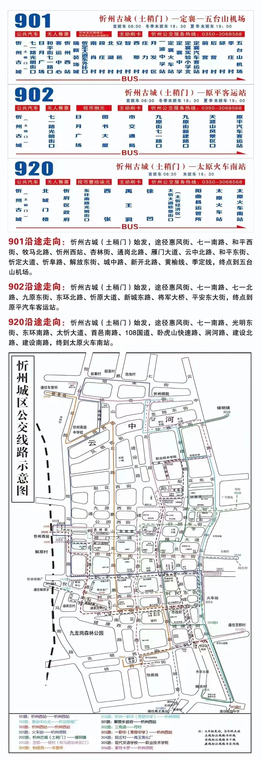 據(jù)悉,忻州古城至太原火車南站城際公交線路名稱為920路,運(yùn)行里程87公里,單程票價(jià)17元,投入20輛公交車,雙向?qū)Πl(fā)。首班發(fā)車時(shí)間6:30,末班發(fā)車時(shí)間18:30,發(fā)車間隔半小時(shí),沿途設(shè)11個(gè)站點(diǎn);忻州古城至原平汽車客運(yùn)站城際公交線路名稱902路,運(yùn)行里程55公里,單程票價(jià)8元,投入10輛公交車,雙向?qū)Πl(fā)。夏季首班發(fā)車時(shí)間6:30,末班發(fā)車時(shí)間19:00。冬季首班發(fā)車時(shí)間6:30,末班發(fā)車時(shí)間18:30,發(fā)車間隔半小時(shí),沿途設(shè)立9個(gè)站點(diǎn);忻州古城至定襄及五臺山機(jī)場城際公交線路名稱為901路,運(yùn)行里程62公里,單程票價(jià)6元,其中忻州到定襄縣城票價(jià)4元,投入10輛公交車,雙向?qū)Πl(fā)。夏季首班發(fā)車時(shí)間6:30,末班發(fā)車時(shí)間19:00。冬季首班發(fā)車時(shí)間6:30,末班發(fā)車時(shí)間18:30,發(fā)車間隔1小時(shí),沿途設(shè)立24個(gè)站點(diǎn)。