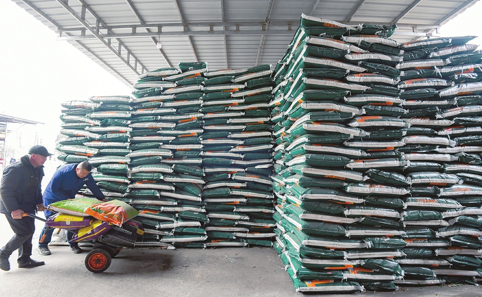 2月24日,長(zhǎng)子縣清風(fēng)農(nóng)資連鎖有限責(zé)任公司院內(nèi),工人在搬運(yùn)化肥。隨著春耕生產(chǎn)臨近,該公司開(kāi)通綠色通道,24小時(shí)不間斷作業(yè),加快化肥裝卸、轉(zhuǎn)運(yùn),全力保障春耕備耕。梁棟攝