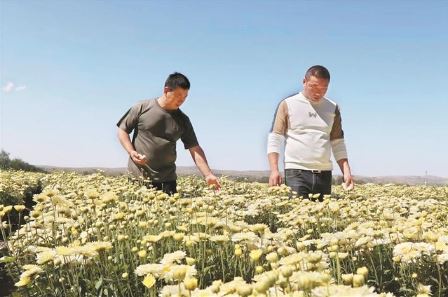 有了方向,行動(dòng)是關(guān)鍵。黨員徐大衛(wèi)主動(dòng)請(qǐng)纓,第一時(shí)間不遠(yuǎn)千里趕赴菊花主產(chǎn)區(qū)射陽(yáng)考察菊花種植項(xiàng)目,經(jīng)過(guò)充分分析研判,篩選適宜五寨種植的品種,最終選定北京菊試種。同時(shí),他帶著誠(chéng)意誠(chéng)心,從射陽(yáng)請(qǐng)來(lái)3名技術(shù)專家。在晉西北中藥材產(chǎn)業(yè)孵化園附近,他與3位專家同吃同住,深入田間地頭,與群眾同勞作、共生活。依據(jù)菊花種植要求,手把手教會(huì)群眾平整土地、開(kāi)挖溝槽、栽種澆水、鋤草施肥和采挖收儲(chǔ)等中藥材精耕細(xì)作技術(shù)。針對(duì)菊花農(nóng)殘、重金屬超標(biāo)的問(wèn)題,在試種過(guò)程中,他精心研究、反復(fù)摸索,大膽探索出了一套適用于菊花的種植技術(shù),實(shí)現(xiàn)了菊花農(nóng)殘可控的突破,先試種的100畝菊花,獲得了成功。