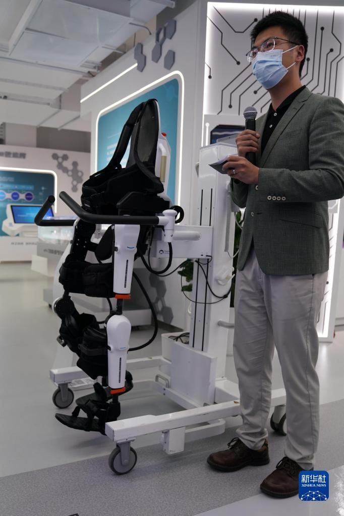 5月11日,在上海城市數(shù)字化轉(zhuǎn)型體驗(yàn)館“解碼生命”區(qū)域,工作人員介紹一款下肢康復(fù)機(jī)器人。新華社記者 馬寧 攝