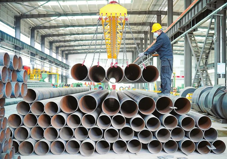 山西萬(wàn)流金屬制品有限公司工人趕制訂單加工螺旋鋼管