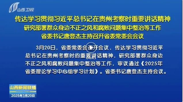 山西日報(bào)報(bào)道 3月20日,省委常委會召開會議,傳達(dá)學(xué)習(xí)貫徹習(xí)近平總書記在貴州考察時(shí)的重要講話精神,研究部署群眾身邊不正之風(fēng)和腐敗問題集中整治等工作,審議通過《2025年省委理論學(xué)習(xí)中心組學(xué)習(xí)計(jì)劃》。省委書記唐登杰主持會議。