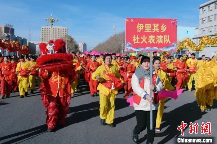 2月12日,農(nóng)歷正月初三,和田市舉行2024年“龍騰盛世·春滿(mǎn)萬(wàn)家”社火活動(dòng),和田市伊里其鄉(xiāng)社火表演隊(duì)巡街。 張亞輝 攝