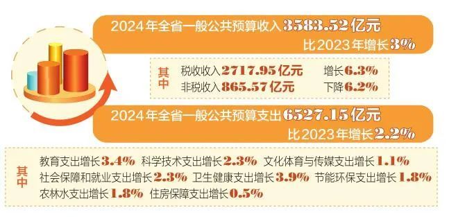 收支管理是財(cái)政工作的核心。按照政府預(yù)算報(bào)告,2024年全省一般公共預(yù)算收入3583.52億元,比2023年增長3%。其中,稅收收入2717.95億元,增長6.3%;非稅收入865.57億元,下降6.2%。全省一般公共預(yù)算支出6527.15億元,比2023年增長2.2%。其中,教育支出增長3.4%,科學(xué)技術(shù)支出增長2.3%,文化體育與傳媒支出增長1.1%,社會(huì)保障和就業(yè)支出增長2.3%,衛(wèi)生健康支出增長3.9%,節(jié)能環(huán)保支出增長1.8%,農(nóng)林水支出增長1.8%,住房保障支出增長0.5%。