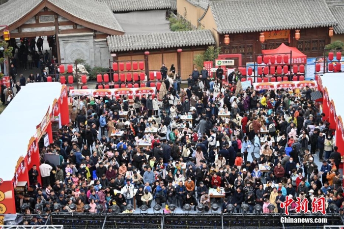 在甘肅天水古城舉行的麻辣燙“吃貨節(jié)”現(xiàn)場,八方游客品嘗麻辣燙。九美旦增 攝