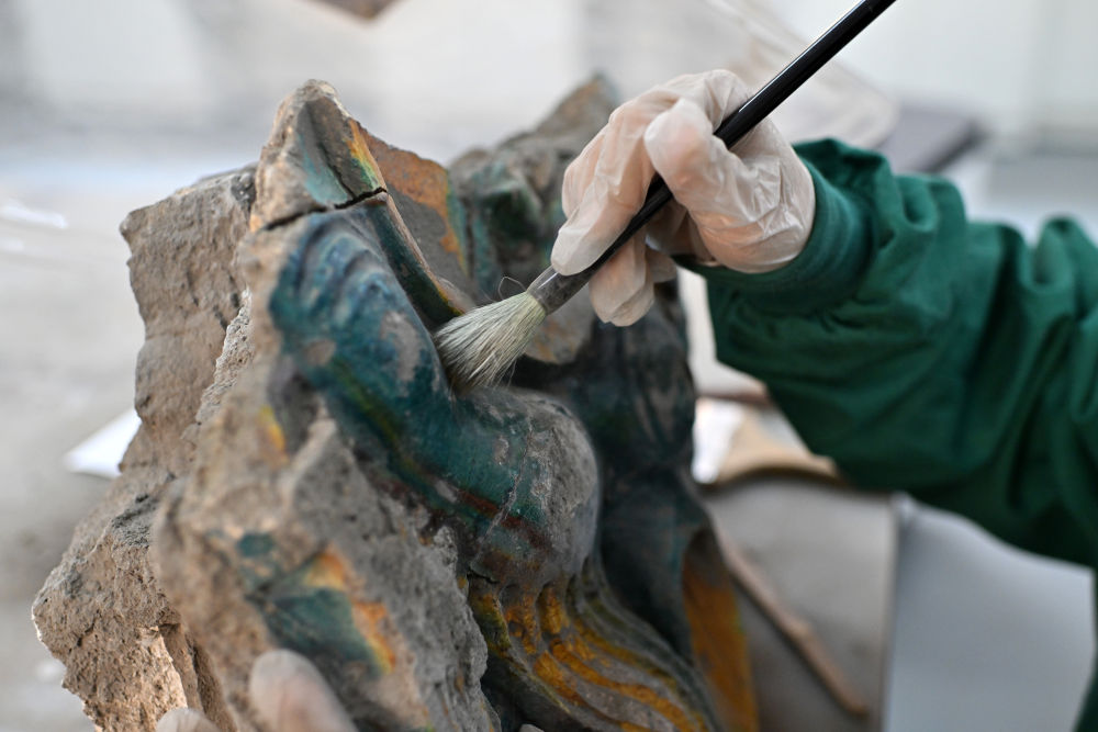 在云岡研究院可移動文物修復室,工作人員韓躍華在進行除塵作業(yè)(2024年2月26日攝)。