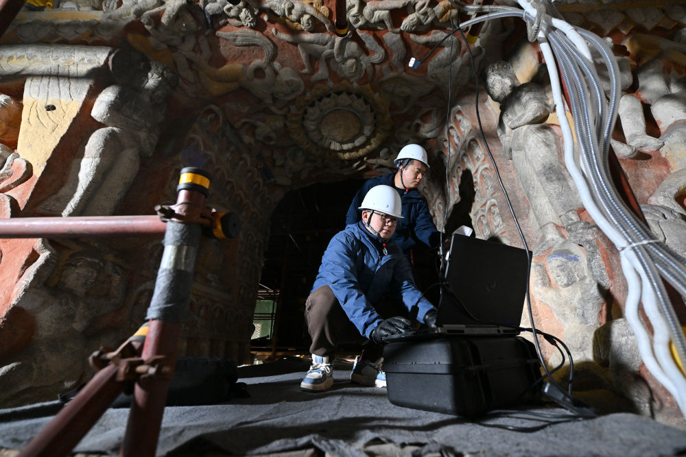 云岡研究院數(shù)字化保護中心工作人員潘鵬(前)和同事杜強在云岡石窟第10窟進行數(shù)據采集(2024年2月27日攝)。
